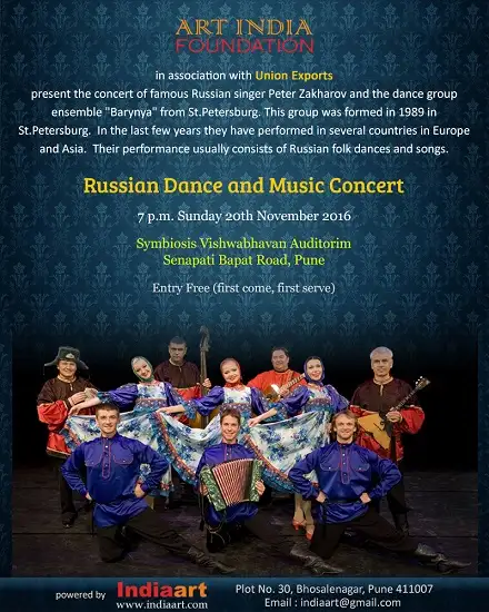 Art India Foundation in association with Union Exports organised the concert of famous Russian singer Peter Zakharov and the dance group ensemble "Barynya" from St. Petersburg. This group was formed in 1989 in St. Petersburg. In the last few years they have performed in several countries in Europe and Asia. Their performance normally consists of Russian folk dances and songs.